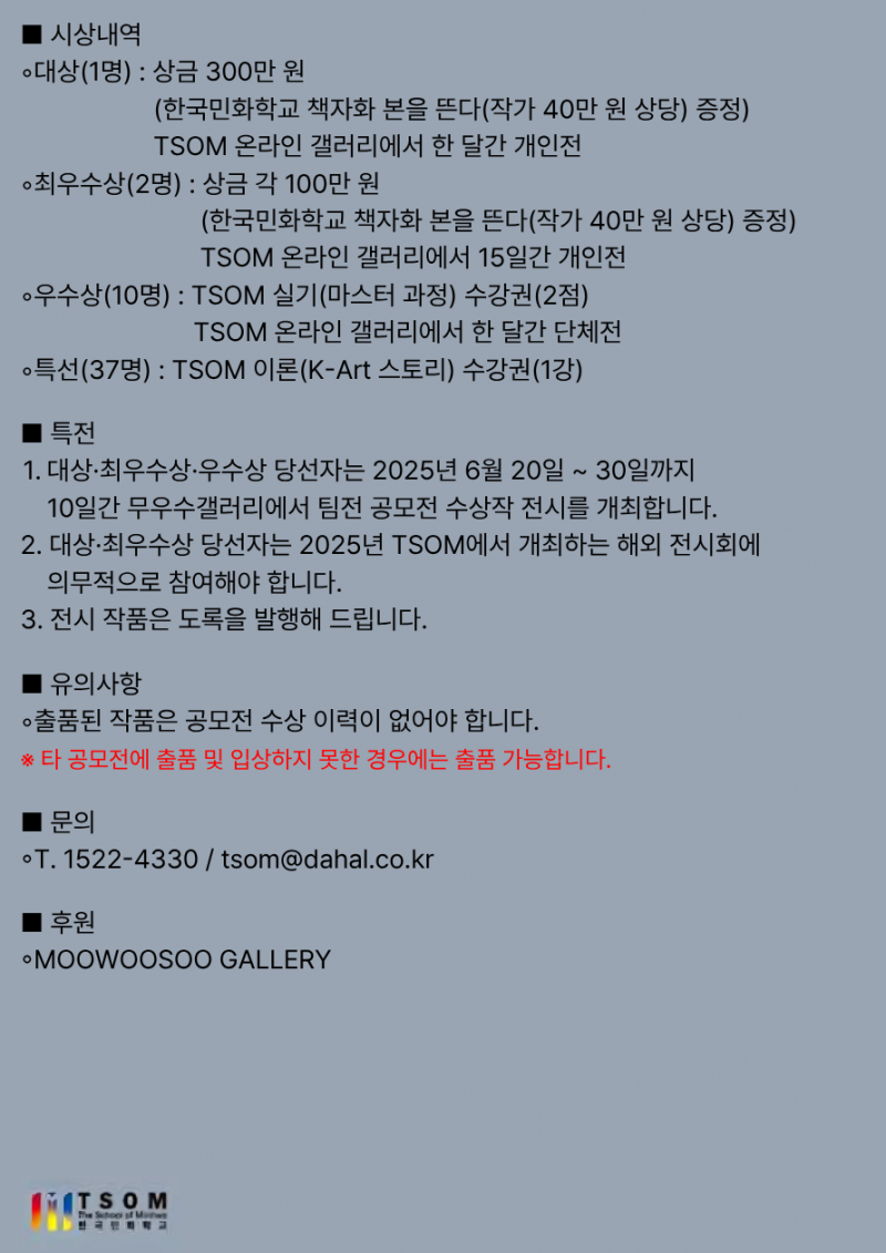2. 대상·최우수상 당선자는 2025년 TSOM에서 개최하는 해외 전시회에 의무적으로 참여해야 합니다. 전시 작품은 도록을 발행해 드립니다.