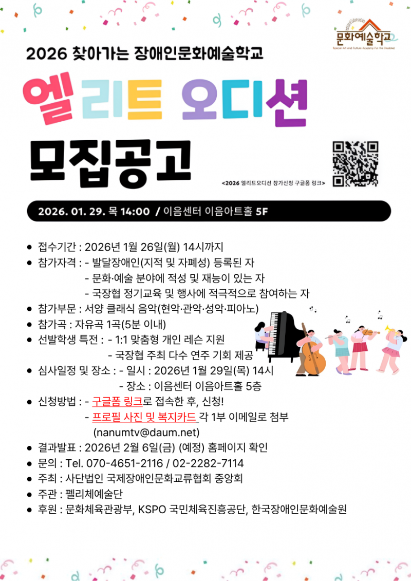 사단법인 국제장애인문화교류협회 중앙회(이하 국장협, 이사장 최공열)가 주최, 펠리체예술단(대표 고재오)이 주관, 문화체육관광부, 국민체육진흥공단, (재)한국장애인문화예술원의 후원으로 2026년 01월 29일(목) 오후 2시에 <찾아가는 장애인문화예술학교>의 ‘엘리트 오디션’을 이음센터 이음아트홀(5F)에서 개최한다. 본 오디션은 서울·경기 지역을 중심으로 클래식 음악을 전공한 발달장애인 예술인을 대상으로 하며, 전문적인 예술교육을 희망하는 발달장애 예술인들에게 실질적인 성장 기회를 지원하기 위해 마련되었다.