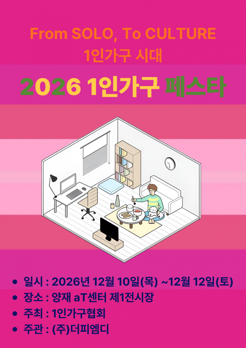 1인가구가 우리 사회의 주류 라이프스타일로 자리 잡으며 새로운 시대의 표준이 되고 있다. 단순히 ‘혼자 사는 일상’을 보여주는 전시를 넘어 1인가구의 삶을 중심으로 형성된 소비와 정책, 문화를 입체적으로 조망하는 국내 유일의 종합 페스티벌 ‘1인가구 페스타 2026(2026 SOLO Living Festa)’이 12월 10일부터 12일까지 서울 양재 aT센터 제1전시장에서 열린다. 주최 측에 따르면 행사는 200개사, 250부스 규모로 구성되며 약 1만 명의 참관객이 방문할 것으로 기대된다.
