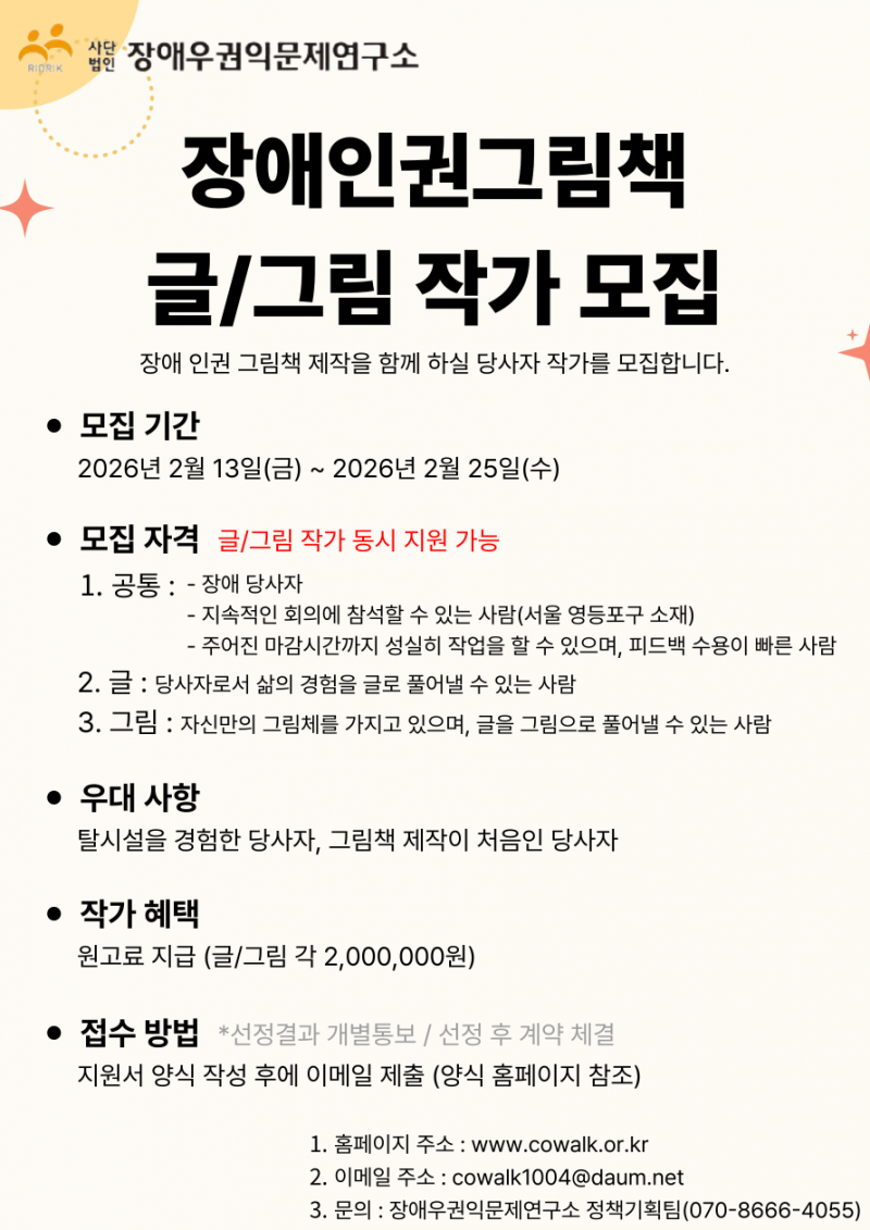 사단법인 장애우권익문제연구소(이사장 김성재, 이하 연구소)는 대중의 장애 인권 감수성 향상과 장애 인식 개선을 위해 ‘2026년 장애인권 그림책’을 함께 제작할 글·그림 작가를 오는 2월 25일까지 모집한다고 밝혔다.