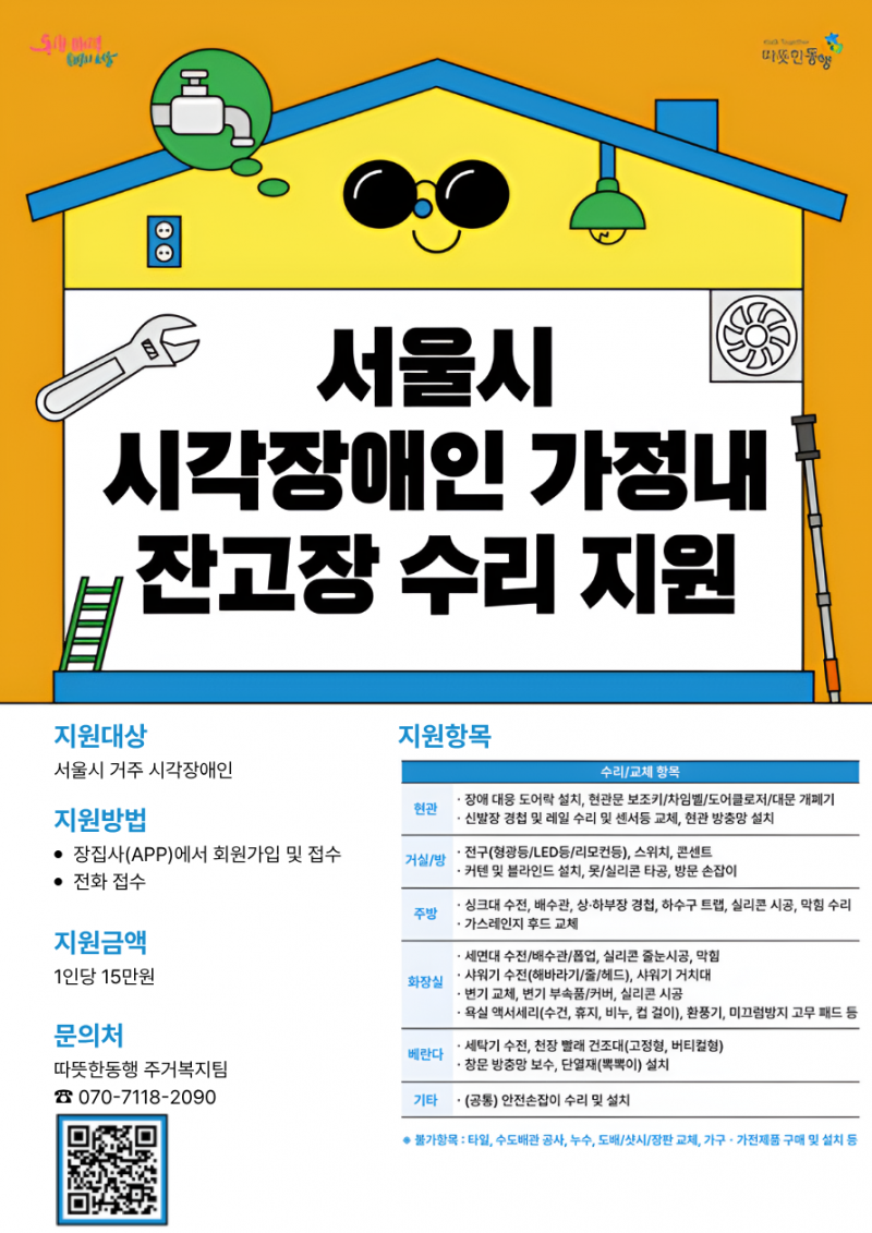 시각장애인을 위해서는 현관 방충망 수선, 안전바 설치, 디지털 도어록·전등·수전·경첩 교체 등의 간단한 잔고장 수리를 지원한다.