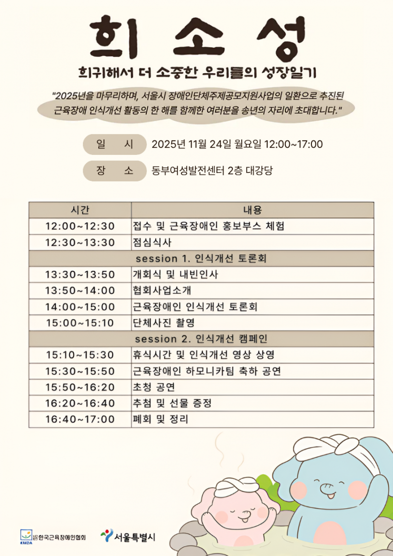 한국근육장애인협회는 서울시 지원을 받아 오는 24일 동부여성발전센터 대강당에서 근육장애인 인식개선 캠페인 ‘희.소.성’을 개최한다고 18일 밝혔다. 행사는 정오부터 오후 5시까지 진행된다.