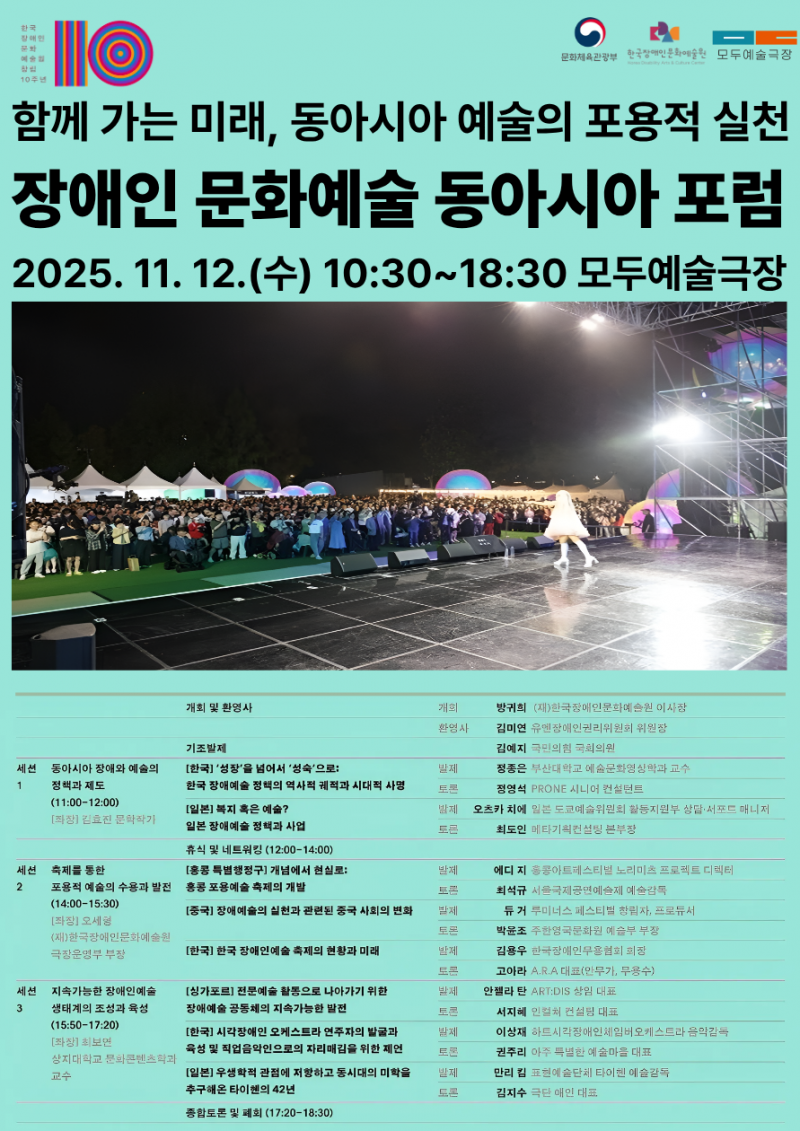(재)한국장애인문화예술원(이하 장문원)이 기관 설립 10주년을 맞아 오는 12일 서울 충정로 모두예술극장에서 '모두예술주간 2025 – 장애인문화예술 동아시아 포럼'을 개최한다.
