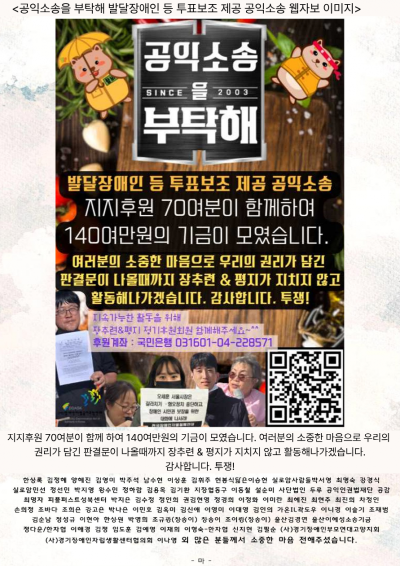 한상록 김정혜 양혜진 김영미 박주석 남수현 이상훈 김휘주 현봉식닮은이승헌 실로암사람들박서영 최명숙 강경식 실로암민선 정선민 박지영 왕수민 정하람 김용목 김기환 지장협동구 이동철 설순미 사단법인 두루 공익인권법재단 공감 최명자 피플퍼스트성북센터 박지은 김수정 정인희 권김현영 정경희 이정화 이미란 최혜진 최현주 최진희 차정인 손희정 조바다 조희은 강고은 박나은 이민호 김옥미 김신애 이영미 이대영 김인의 가온IL곽도우 이니경 이슬기 조재범 김순남 정성규 이현아 한상원 박영희 조규광(장송이) 장송이 조이랑(장송이) 울산김경연 울산이혜성소송기금 정다운/한자협 이해경 김정 임도훈 김예영 이재희 이형숙-한자협 신지현 김필순 (사)경기장애인부모연대고양지회 (사)경기장애인자립생활센터협의회 이나영 외 많은 분들께서 소중한 마음 전해주셨습니다.