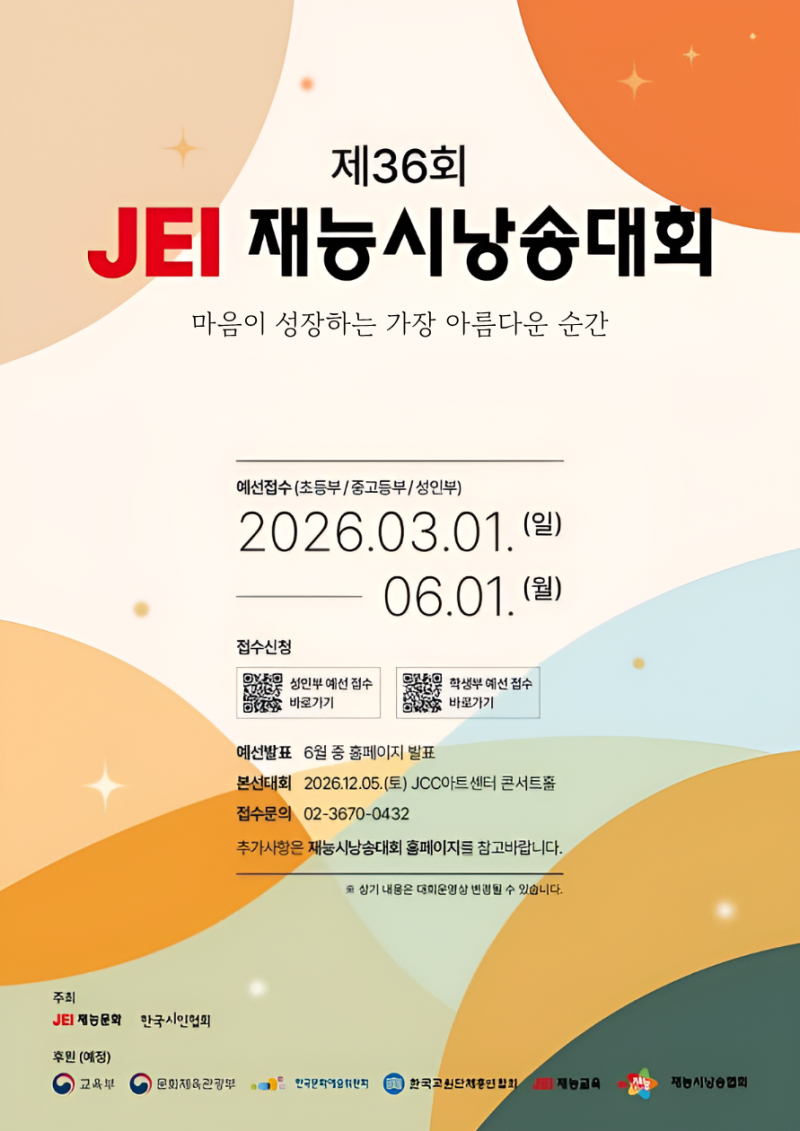 - ‘제36회 재능시낭송대회’를 개최하오니 많은 응모 바랍니다.