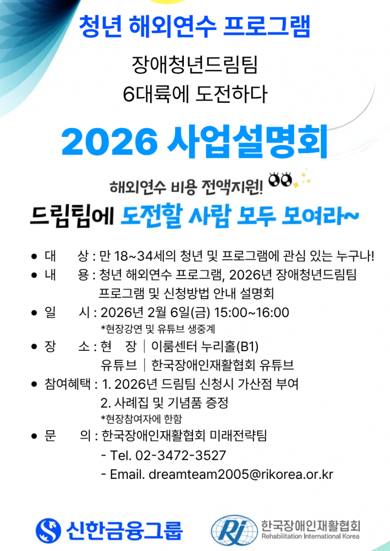 (정보제공) 청년 해외연수 프로그램, 2026년 장애청년드림팀 6대륙에 도전하다 사업설명회