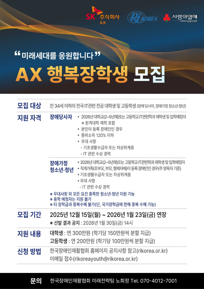 ▶장학생 모집 : 2025년 12월 15일(월) ~ 1월 23일(금) 기간 연장