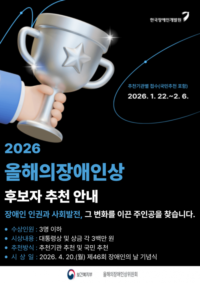 (정보제공) ‘2026년도 올해의 장애인상’ 주인공을 찾습니다_22일부터 46개 추천기관 추천, 국민추천 방식으로 수상후보자 …