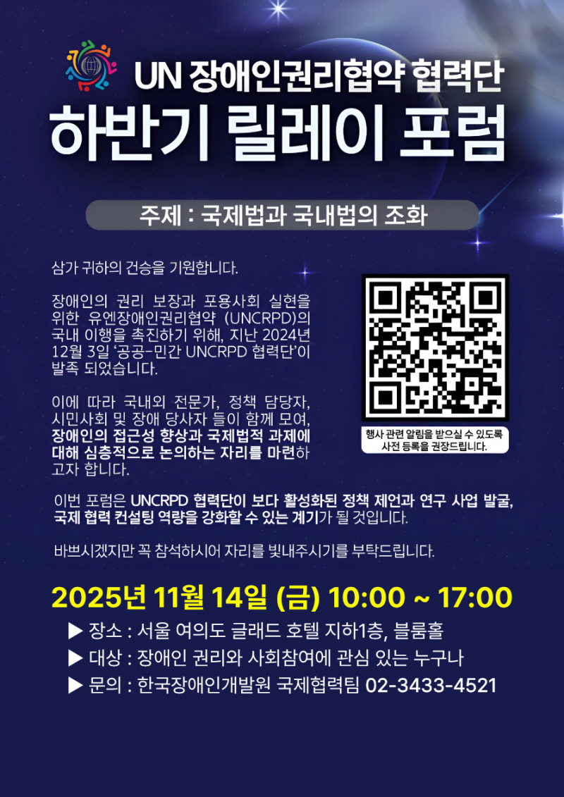 이번 포럼은 지난해 12월 발족한 공공·민간 UNCRPD(유엔장애인권리협약) 협력단 활동의 일환으로, 장애인의 권리 보장과 사회 참여 확대를 위한 국제법·국내법 간 조화 방안을 집중적으로 다룬다.