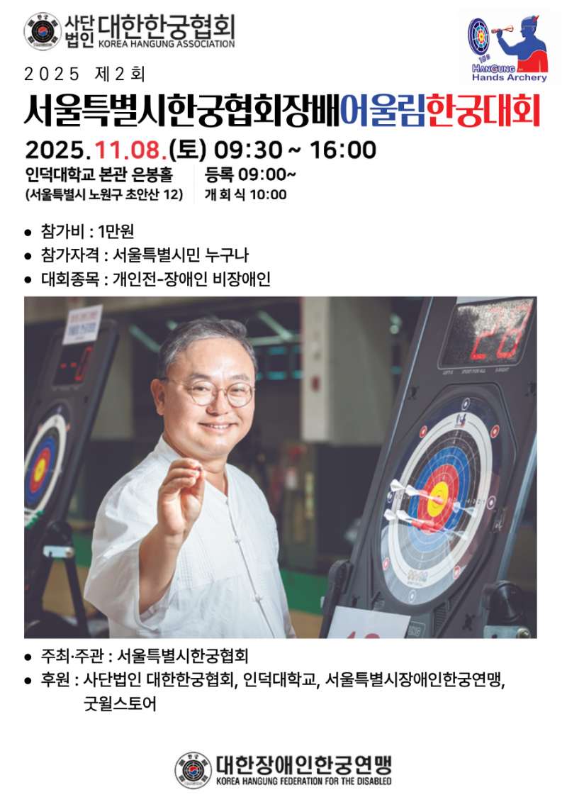 두 번째 대회인 ‘제2회 서울특별시한궁협회장배 어울림 한궁대회’는 11월 8일 오전 9시 30분부터 오후 4시까지 노원구 인덕대학교 본관 은봉홀에서 열린다. 서울특별시장애인한궁연맹 소속 선수 50여 명과 비장애인 선수 등 약 200명이 참가해 통합 스포츠의 가치를 실천한다. 한궁 창시자인 허광 대한한궁협회 회장과 김광만 인덕대학교 총장이 주요 인사로 참석할 예정이다.