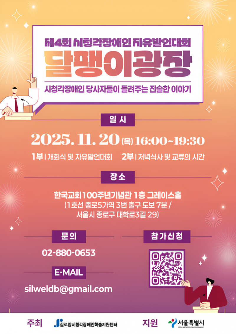시청각장애인이 평소 표현하기 어려웠던 생각과 마음을 자유롭게 이야기할 수 있는 ‘2025년 제4회 시청각장애인 자유발언대회 달팽이광장’이 오는 11월 20일 오후 4시부터 7시 30분까지, 한국교회 100주년기념관 1층 그레이스홀에서 개최된다.