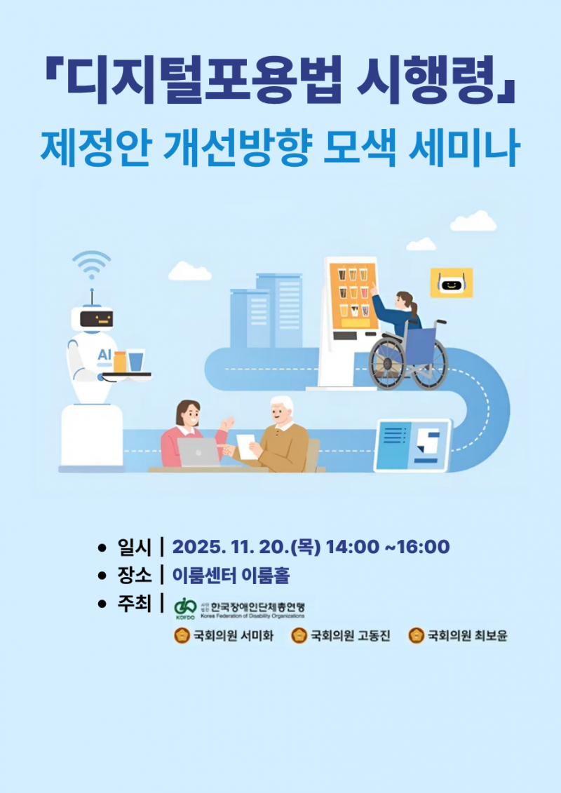 이날 세미나는 장애인을 포함한 모든 국민이 접근 가능한 디지털포용 정책 기반 마련, ‘디지털포용법 시행령’ 제정 과정에서 장애포용적 관점이 제도적으로 반영될 수 있도록 실효적인 제언을 도출하는 것이 목표다.