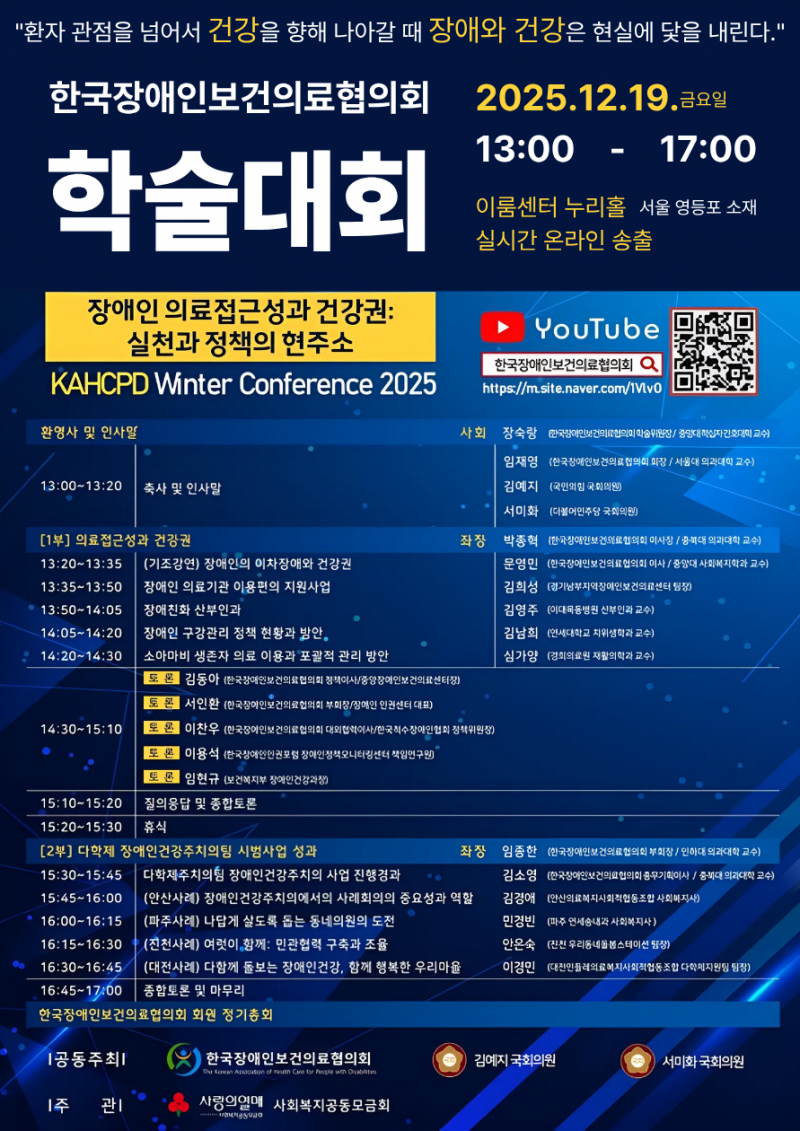 사단법인 한국장애인보건의료협의회는 오는 19일 오후 1시 서울 여의도 이룸센터 누리홀에서 ‘2025년 동계 학술대회’를 개최한다고 밝혔다.