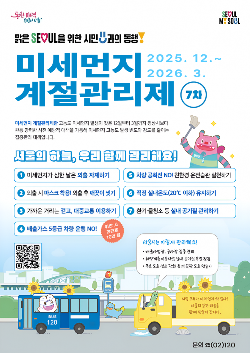 서울시는 12월부터 내년 3월 31일까지 ‘제7차 미세먼지 계절관리제’를 시행한다. 4개 분야(수송, 난방, 사업장, 노출저감) 13개 대책을 통해 초미세먼지(PM2.5) 142톤, 질소산화물(NO2) 2,975톤 감축을 목표로 한다.