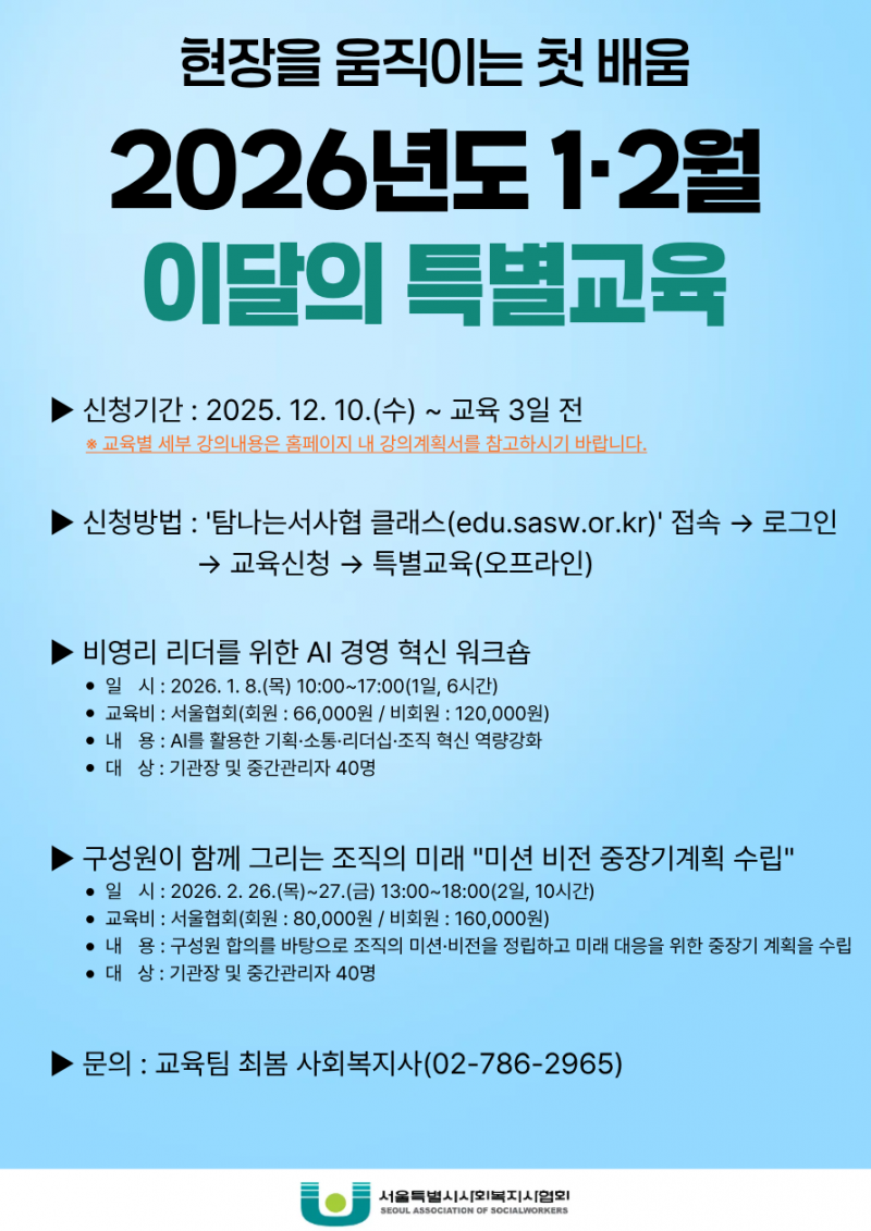 우리 협회는 변화하는 환경 속에서 사회복지시설 리더의 역량을 강화하고, 지속가능한 조직 운영과 혁신 실천을 돕기 위한 특별교육을 실시하오니 많은 관심과 참여 부탁드립니다.
