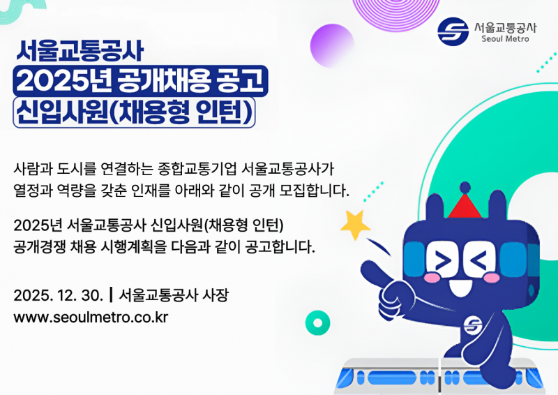 서울교통공사에서 2026년 신입사원(채용형인턴, 기능인재, 철도교통관제사, 청원경찰)을 공개 채용하고 있다.