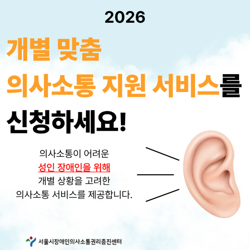 신청 기간은 2026년 1월 23일 오후 6시까지이며, 서울시장애인의사소통권리증진센터 홈페이지(www.scom.or.kr) 오른쪽 상단 ‘서비스 신청’ 메뉴를 통해 접수 가능하다. 자세한 사항은 소통지원팀(☎070-4943-4020)으로 문의하면 된다.
