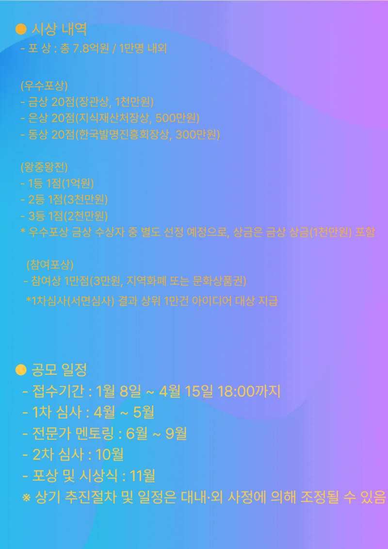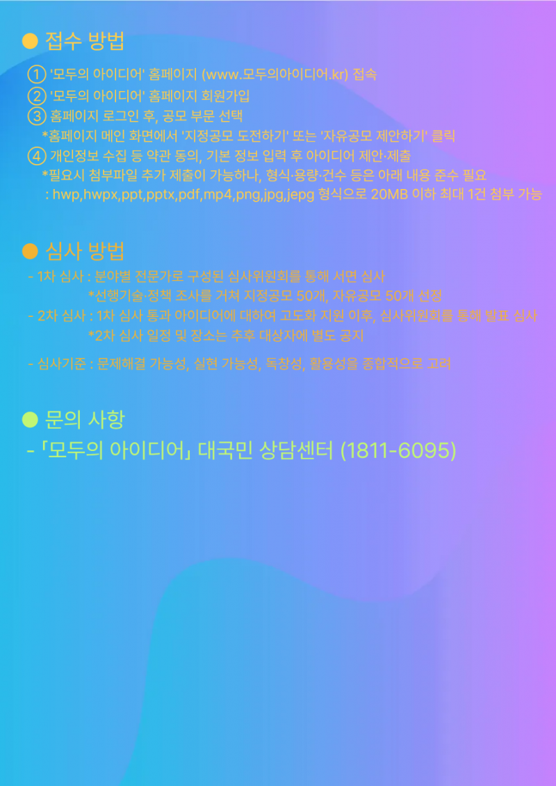 - 산업·경제·사회 전반의 문제해결을 위해 주제나 분야 제한 없는 아이디어를 자유롭게 공모