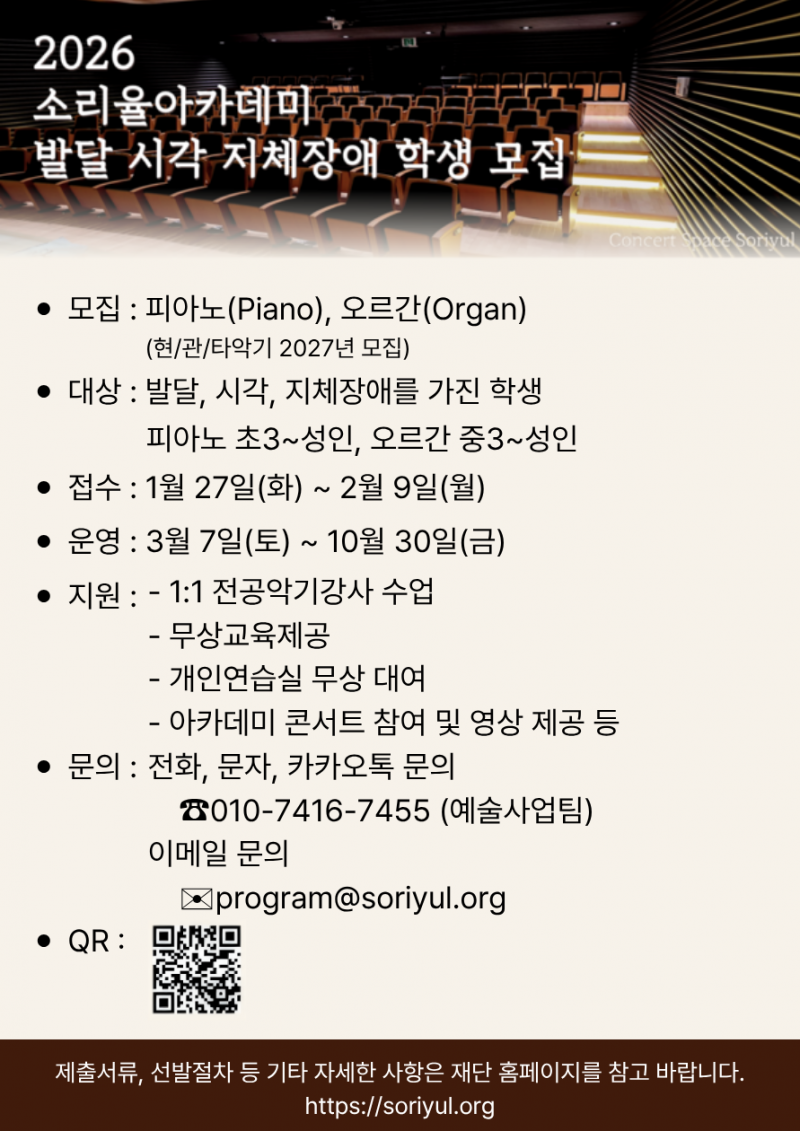 문화예술 재단법인 소리율이 운영하는 소리율아카데미가 오는 2월 9일까지 2026년 교육과정에 참여할 발달·시각·지체 장애 학생을 모집한다.