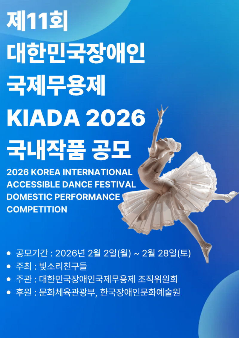 사단법인 한국장애인무용협회가 주최하는 제11회 대한민국장애인국제무용제(KIADA2026)는 국내 장애인 무용가들의 예술 역량을 발굴하고 국제 교류의 기회를 마련하기 위해 참가 작품을 공모한다고 밝혔다.