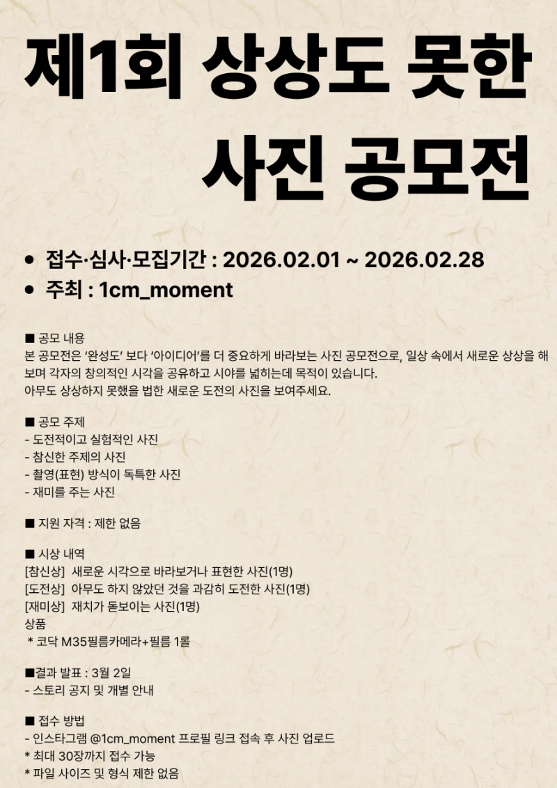 - 공모전 관련 문의는 인스타그램@1cm_moment DM으로 부탁드립니다.