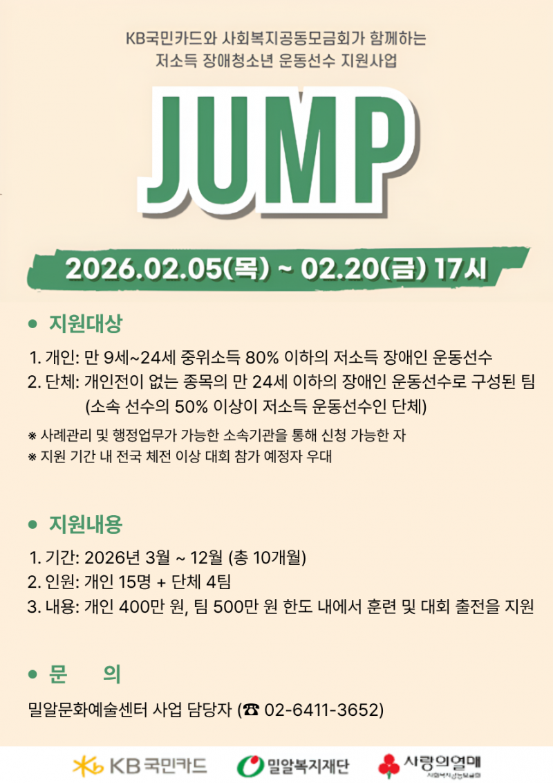 밀알복지재단이 KB국민카드가 후원하고 사회복지공동모금회 지정기탁사업으로 운영하고 있는 저소득 장애청소년 운동선수 지원 사업 ‘점프(JUMP)’ 대상자를 모집한다.