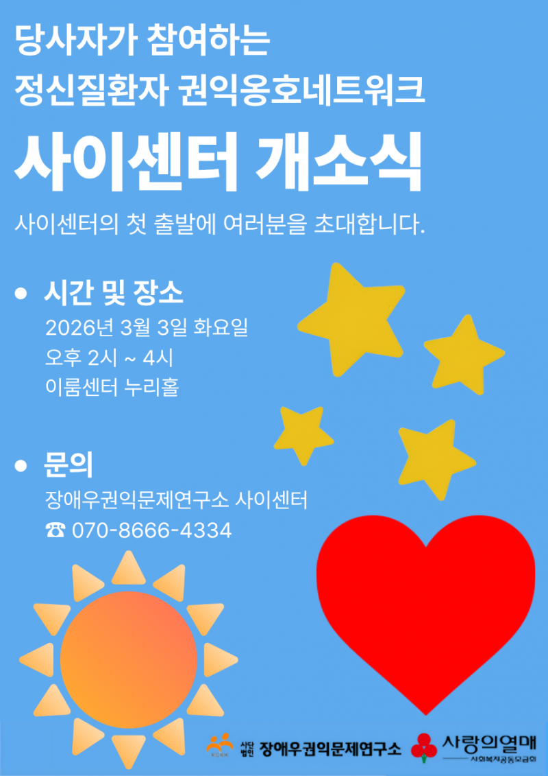 사단법인 장애우권익문제연구소(이사장 김성재)가 오는 3월 3일 오후 2시 서울 영등포구 이룸센터 누리홀에서 '당사자가 참여하는 정신질환자 권익옹호네트워크 사이센터' 개소식을 개최한다.