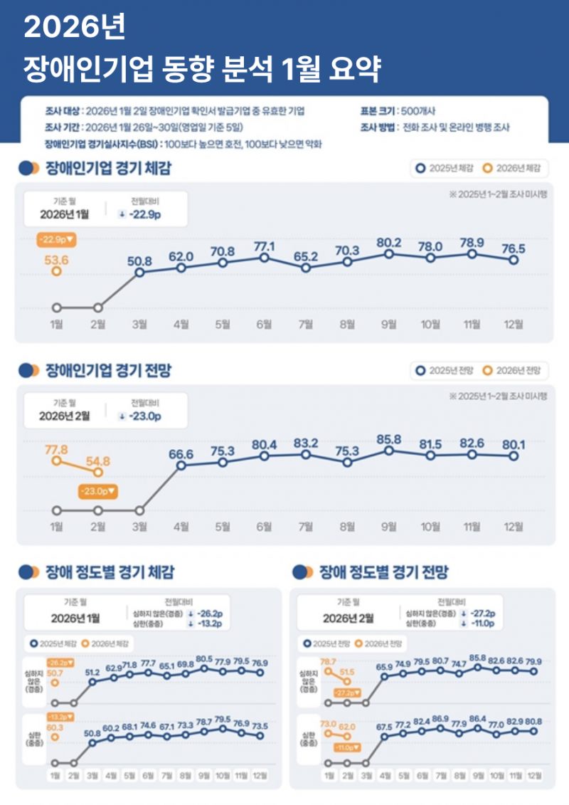 2026년 1월 장애인기업 동향 조사 결과, 장애인기업의 1월 경기 체감 지수(BSI)가 53.6p로 전월 대비 22.9p 하락했으며, 2월 경기 전망 지수는 54.8p로 전월 대비 23.0p 하락했다. 이는 체감 및 전망 지수 모두 조사를 시작한 이래 가장 큰 폭으로 떨어진 수치다.
