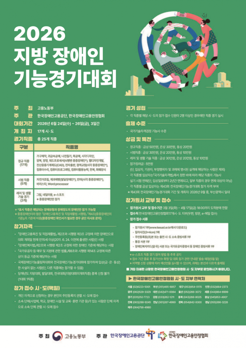 고용노동부(장관 김영훈)가 주최하고, 한국장애인고용공단(이사장 이종성)과 (사)한국장애인고용안정협회(협회장 이건휘)가 공동 주관하는 「2026년도 지방장애인기능경기대회」 원서 접수가 4월 17일(금)까지 진행된다.
