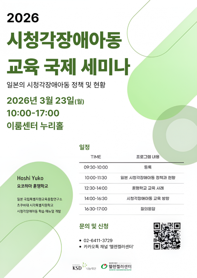 홍유미 헬렌켈러센터장은 “일본 시청각장애아동 교육 분야를 선도하는 전문가를 초청해 정책과 제도, 학교 현장의 실제 사례를 살펴보는 이번 국제세미나는 국내 교육과 복지 현장에서 실질적인 참고 자료가 될 것”이라며 “여러 분야의 전문성을 강화하고 시청각장애아동을 위한 통합적 지원의 필요성에 대한 공감대를 확산하는 계기가 되길 기대한다”고 밝혔다.