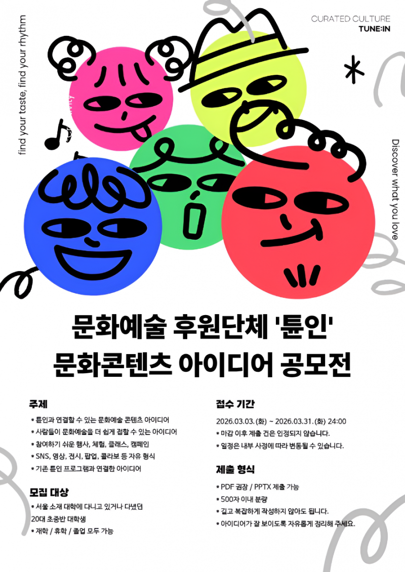 문화예술 후원단체 튠인(Tune in)과 함께 문화예술을 더 쉽고 재미있게 즐길 수 있는 아이디어를 모집합니다.
