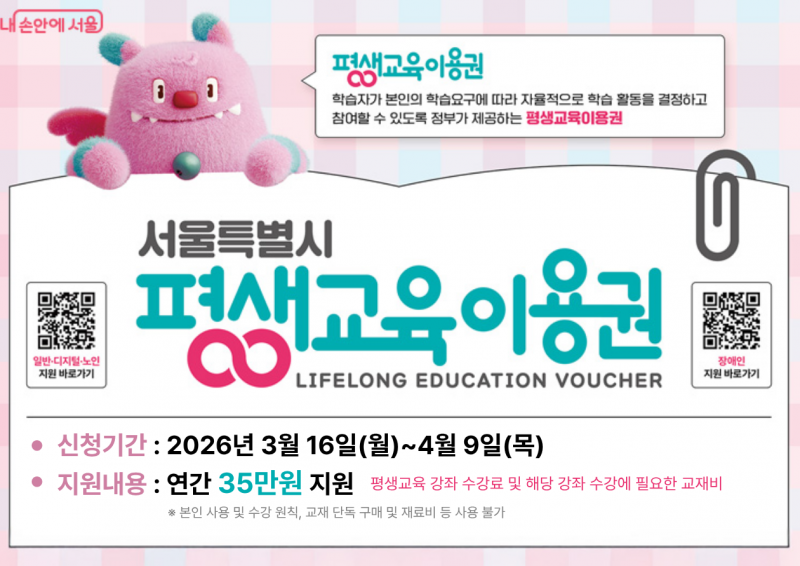 서울시는 시정 핵심 가치인 ‘약자와의 동행’의 일환으로 오는 4월 9일 오후 6시까지 ‘2026년 서울시 평생교육이용권’ 1차 수혜자를 모집한다.