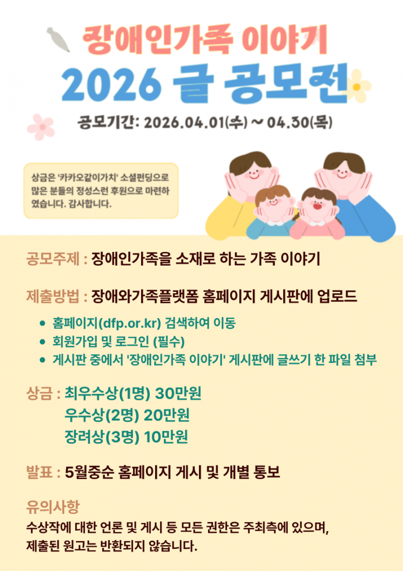 한편, 수상작에 대한 언론 게재 및 활용 권한은 주최 측에 귀속되며, 제출된 원고는 반환되지 않는다. 자세한 사항은 장애와가족플랫폼 사회적협동조합(☎0505-055-6789)으로 문의하면 된다.