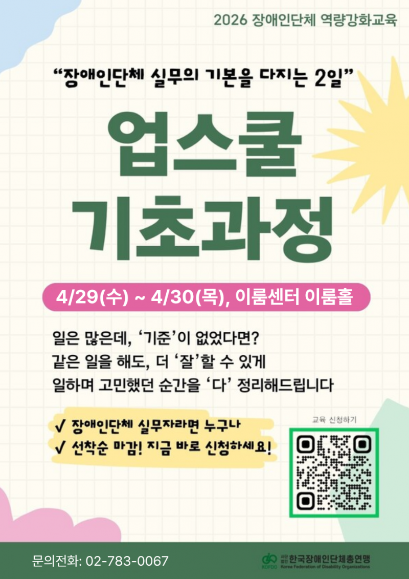 한국장애인단체총연맹(한국장총)은 오는 29일부터 이틀간 ‘2026 장애인단체 역량강화교육 업스쿨(UpSchool) 기초과정’을 운영하고 참가자를 모집한다고 밝혔다.