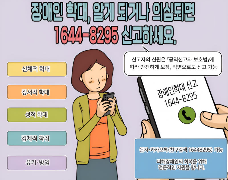 장애인권익옹호기관 관계자는 “의심되는 상황을 목격했을 때는 주저 없이 전국 장애인학대 신고전화(1644-8295)나 카카오톡 채널(‘학대신고’ 검색) 등을 통해 즉시 신고해 주길 바란다”고 당부했다.