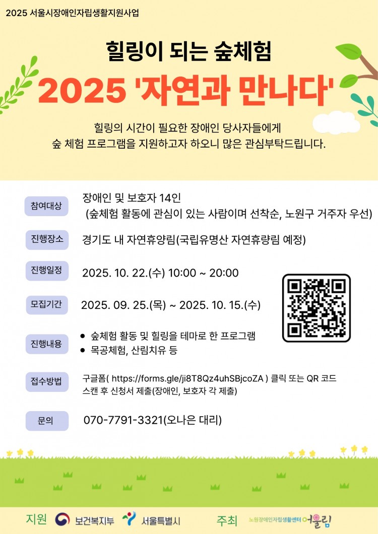가. 참여대상: 장애인 및 보호자 14인(숲체험 활동에 관심이 있는 자, 선착순, 노원구 거주자 우선)