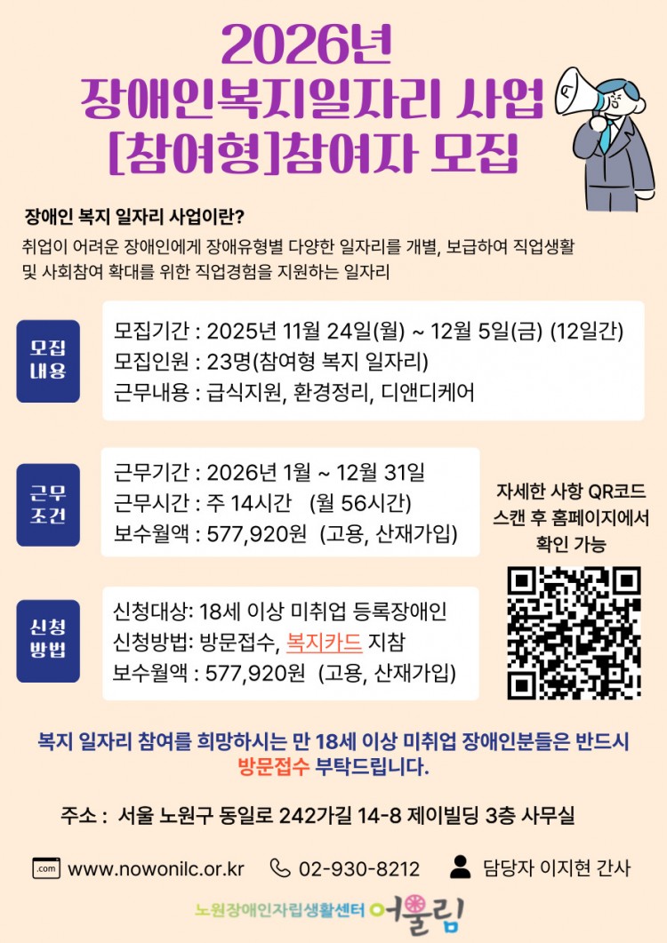 << 2026년 장애인복지일자리 참여형 참여자 모집>>
