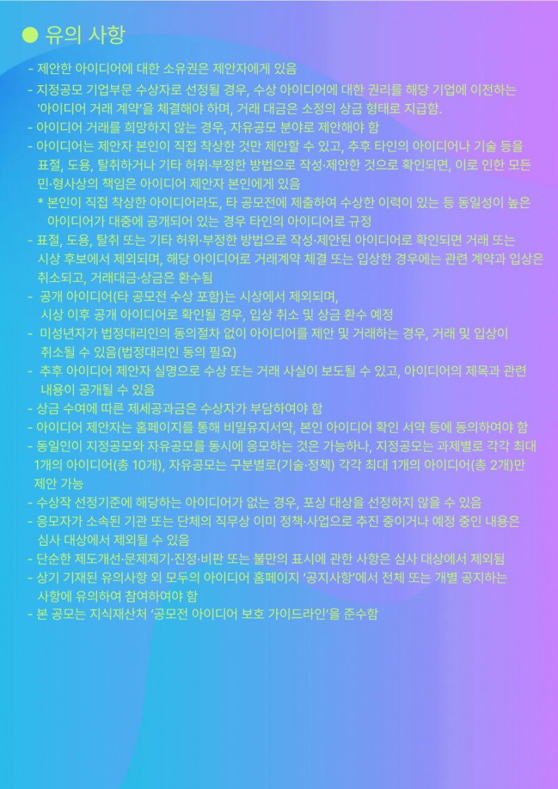 - 상기 기재된 유의사항 외 모두의 아이디어 홈페이지 ‘공지사항’에서 전체 또는 개별 공지하는 사항에 유의하여 참여하여야 함
