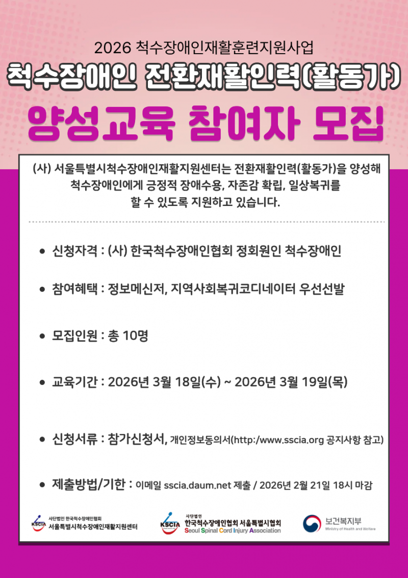 (사) 서울특별시척수장애인재활지원센터는 전환재활인력(활동가)을 양성해 척수장애인에게 긍정적 장애수용, 자존감 확립, 일상복귀를 할 수 있도록 지원하고 있습니다.