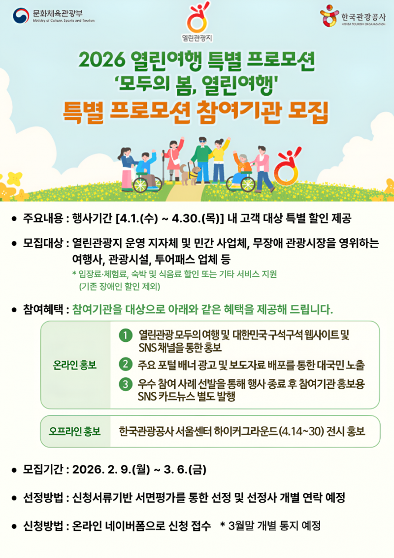 한국관광공사가 무장애 관광 확산을 위한 특별 프로모션에 나선다. 공사는 오는 2월 9일부터 3월 6일까지 ‘2026 열린여행 특별 프로모션–모두의 봄, 열린여행’에 참여할 지방자치단체와 관광 관련 기업을 공개 모집한다고 밝혔다.