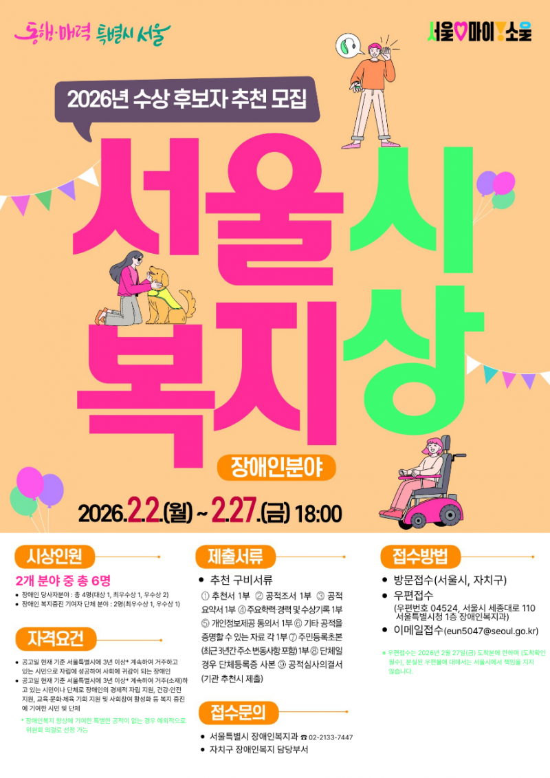 서울시가 오는 27일까지 '2026년 서울시 복지상(장애인분야)' 수상 후보자를 모집한다.