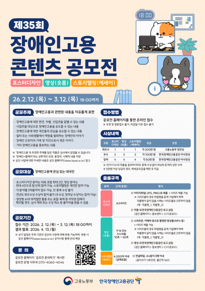 고용노동부와 한국장애인고용공단이 '2026년 제35회 장애인고용 콘텐츠 공모전'을 개최, 오는 3월 12일까지 작품을 접수받는다.