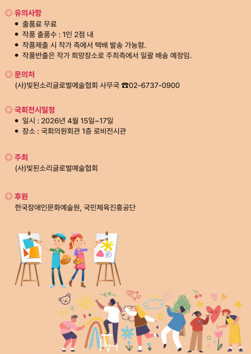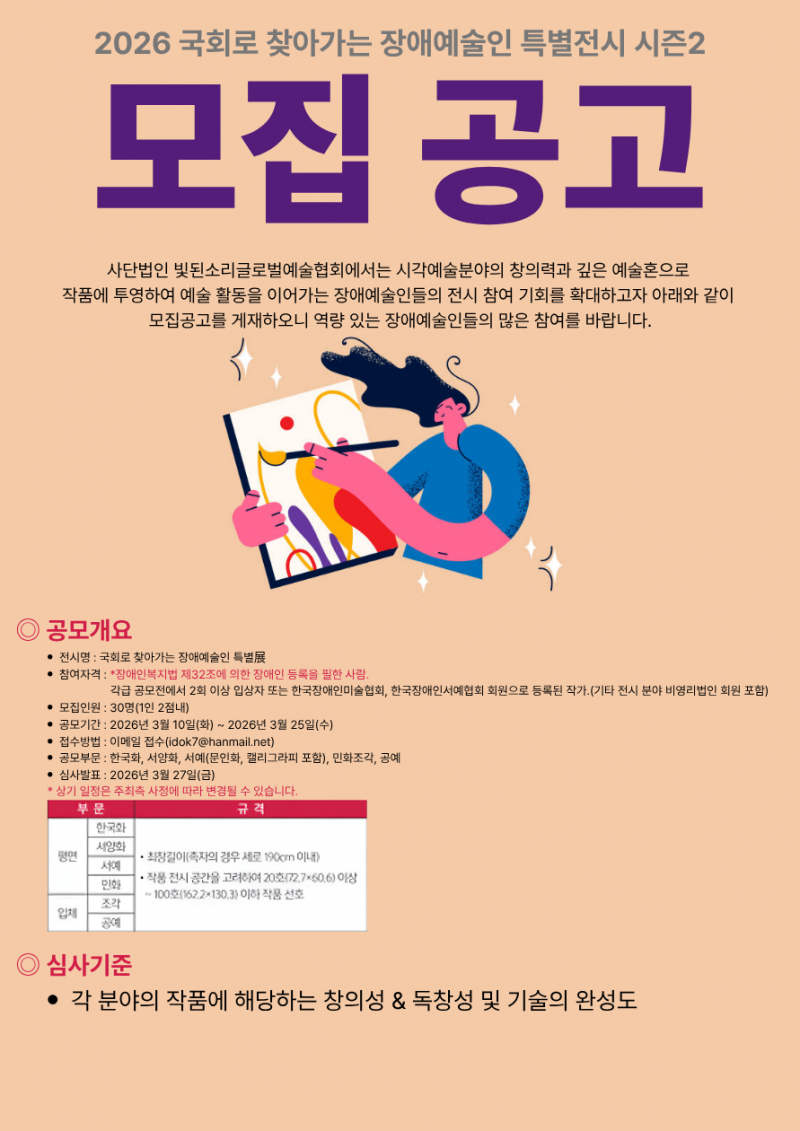 빛된소리글로벌예술협회가 김승수·서미화·이정헌 의원과 공동 주최로 진행하는 ‘국회로 찾아가는 장애예술인 특별전시 시즌2’ 참여 작가를 오는 25일까지 모집한다.