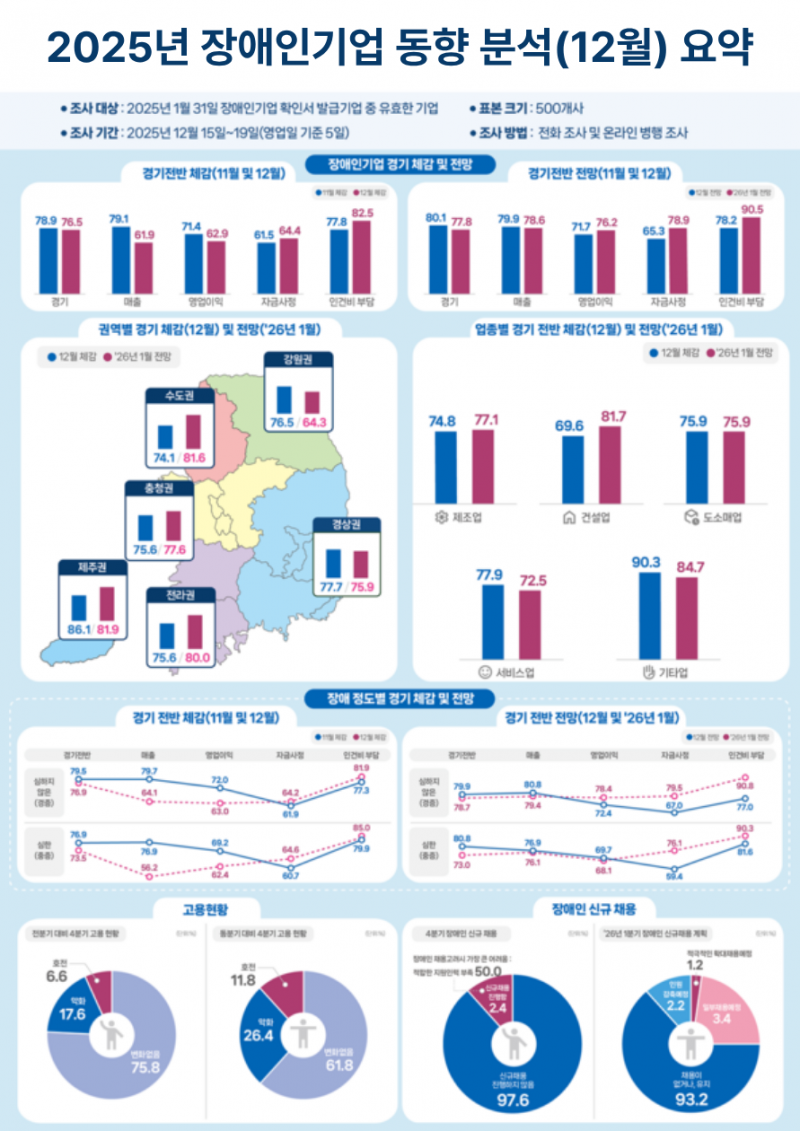 장애인기업종합지원센터(이사장 박마루)는 2025년 12월 장애인기업 경기실사지수(BSI)를 발표하며, 경기 체감 지수가 76.5p로 전월 대비 2.4p 하락했다고 1월 29일 밝혔다.