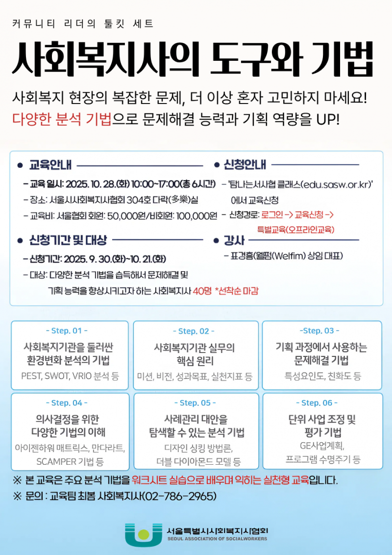 우리협회는 사회복지 현장에서 활용할 수 있는 다양한 분석 기법을 습득해서 복잡한 문제를 해결하고 기획 능력을 향상시킬 수 있는 특별교육을 실시하오니 많은 관심과 참여 바랍니다.