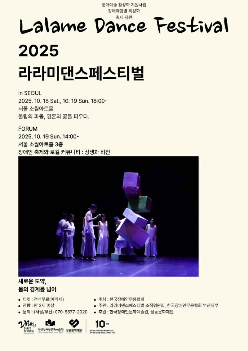 한국장애인무용협회가 주최하고 한국장애인문화예술원, 성동문화재단이 후원하는 ‘2025 라라미댄스페스티벌’이 오는 18일부터 19일까지 서울 성동구 소월아트홀에서 열린다.