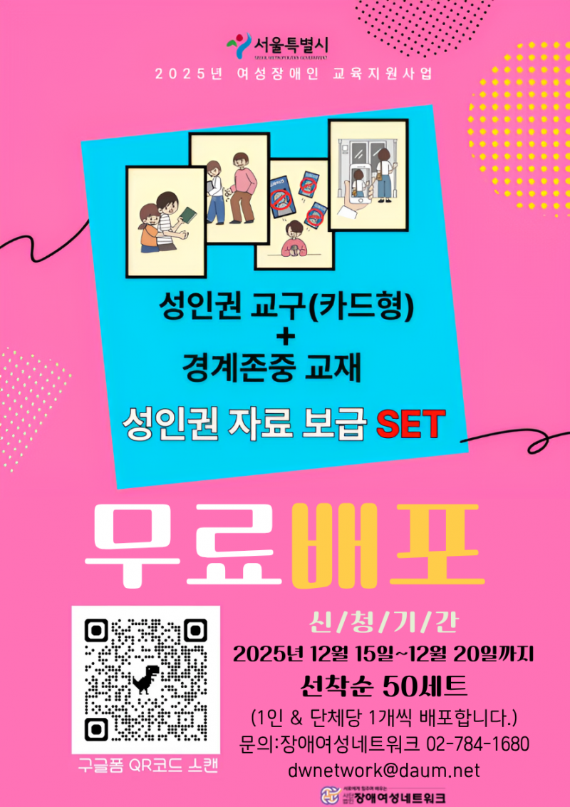 장애여성네트워크가 서울시에서 지원하는 여성장애인교육지원센터 역량강화 사업의 일환으로 발달장애인을 위한 ‘성인권 자료(카드형)’를 제작, 오는 15일부터 20일까지 선착순으로 50세트를 무료 배포한다.