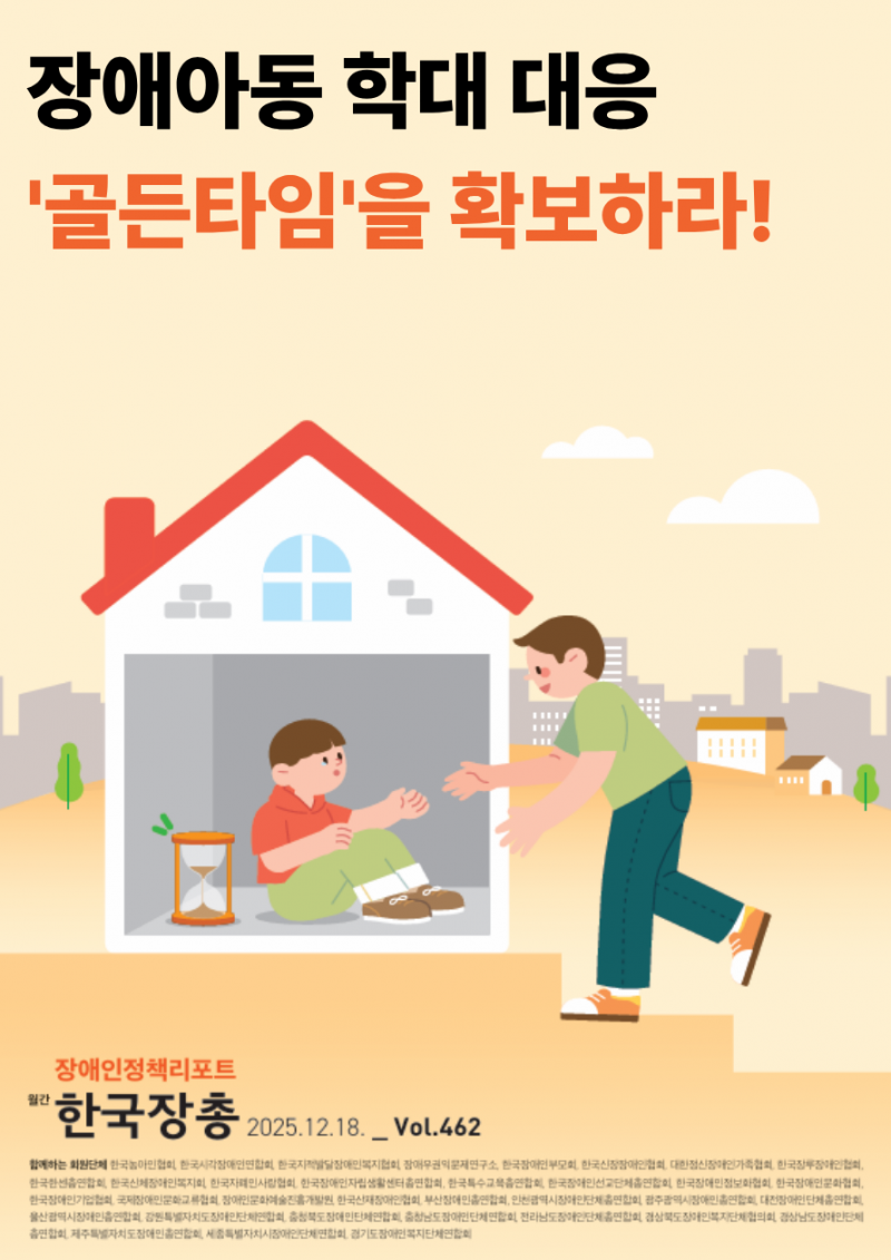 한국장애인단체총연맹(이하 한국장총)은 장애아동 학대 대응 시스템의 현주소를 진단하고 실효성 있는 개선 방안을 담은 ‘애인정책리포트 제462호 ’장애아동 학대 대응-골든타임’을 확보하라‘를 발간했다.