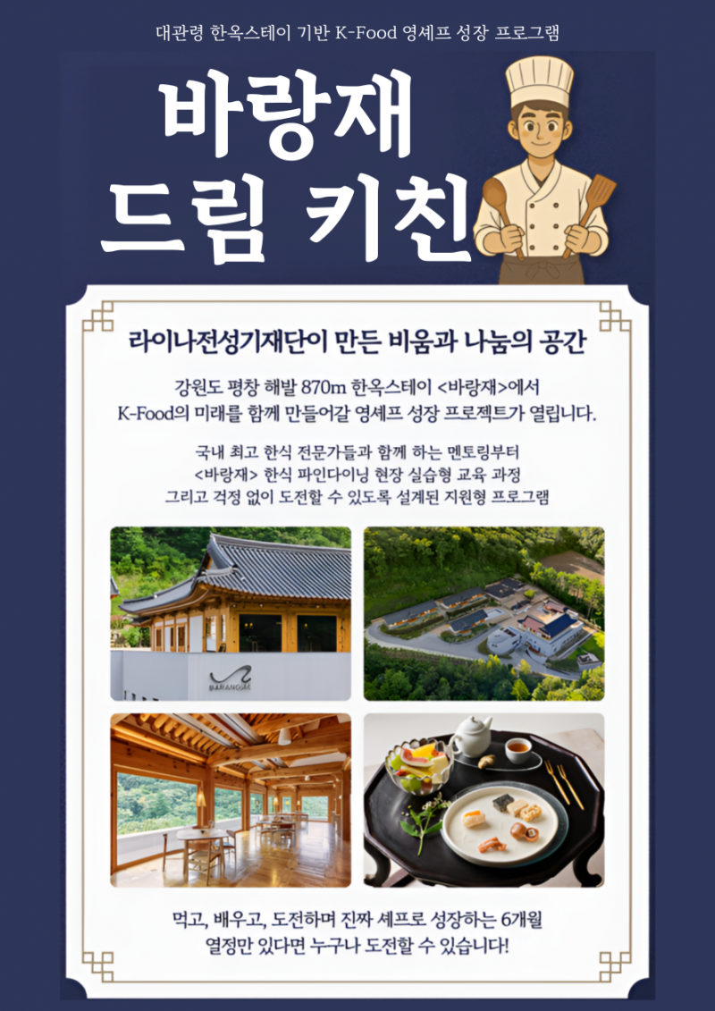라이나생명의 사회공헌재단인 라이나전성기재단(이사장 홍봉성)은 강원도 평창 해발 870m에 위치한 한옥스테이 ‘바랑재’를 기반으로 K-Food의 미래를 이끌 청년 셰프를 발굴·육성하는 프로젝트 「바랑재 드림 키친」 참가자를 모집한다고 밝혔다.