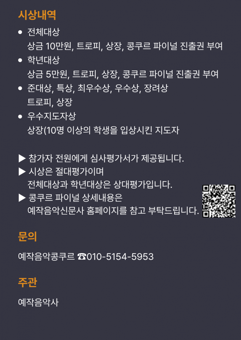 예작음악콩쿠르에서 대상이상 입상시 콩쿠르 파이널 진출권을 부여받게 됩니다.
